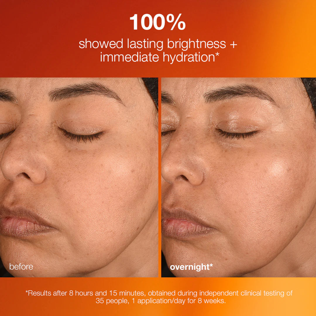 An overnight serum with ultra-stable Vitamin C and Pro-Vitamin D Complex helps restore moisture barrier for long-lasting radiance, hydration, and improved tone.